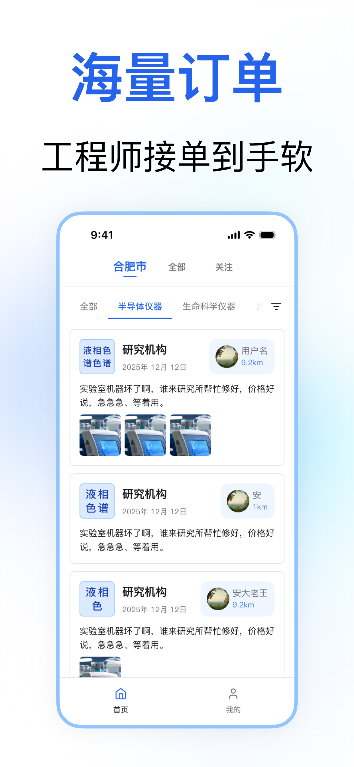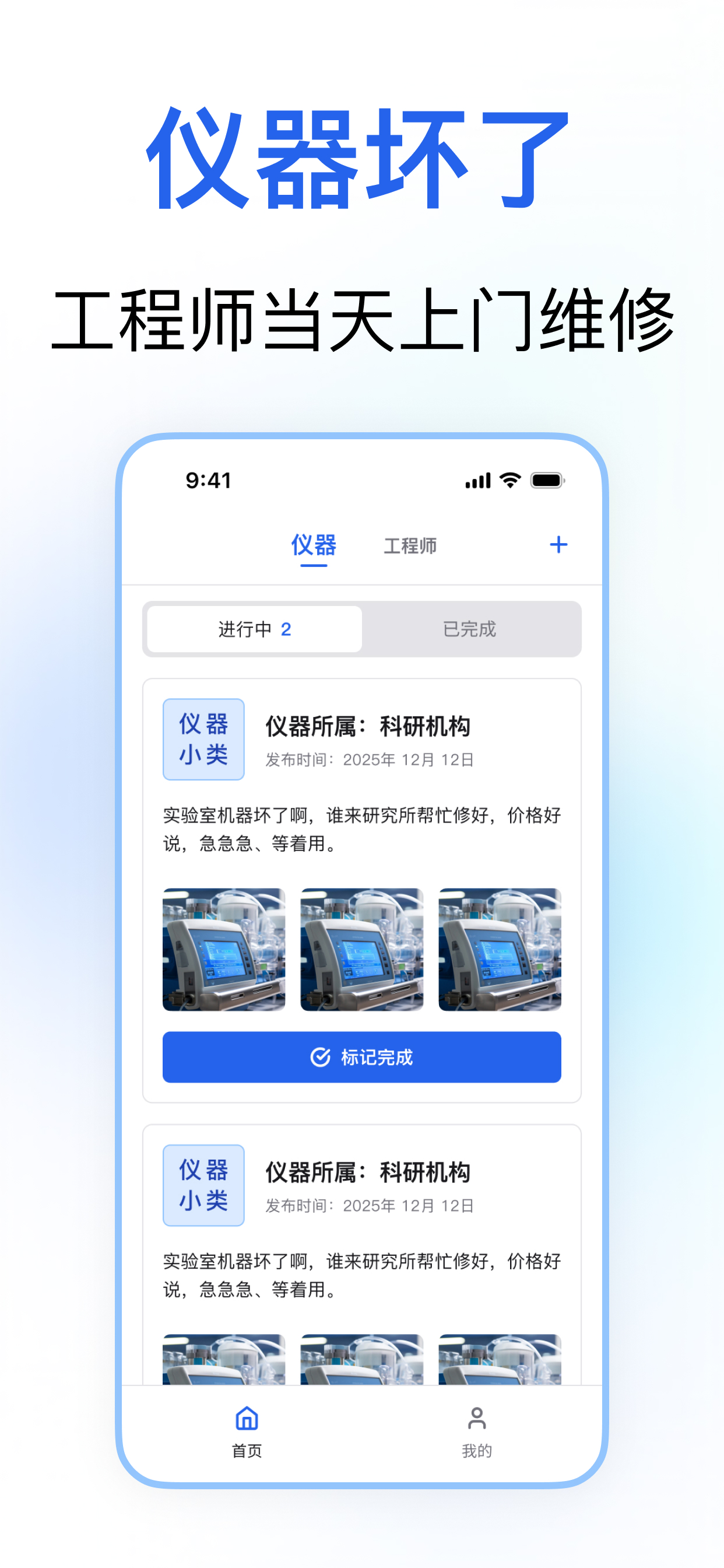 仪器通可以帮助用户快速找到维修工程师,也可以帮助维修工程师高效接单的一款APP 我们借助互联网技术,整合仪器设备上下游资源,打造及时、专业、低成本的全国性售后服务网络,为终端用户提供更快更满意的维修服务。同时,帮维修工程师更便捷,高效的接单 特点: 1、方便快捷:可以帮用户快就近找到维修工程师,即坏即修,高效便捷 2、降低陈本:就近找工程师,简化流程,大幅降低仪器维修成本 3、海量订单:业务覆盖全国,订单长期稳定,帮工程师增加收入 4、聚合功能:平台聚合仪器设备的安装、维修、维护、技术咨询、培训等多种类型 5、免费入驻:用户或工程师全免费入驻 功能: 1、仪器维修订单,全网可见,工程师就近接单 2、用户发布仪器维修订单,系统自动匹配,匹配最合适的工程师 3、信息透明,直接沟通 4、口碑打造:从工程师响应速度、服务满意度、服务专业度等多维度服务数据全方位展示,打造工程师的好口碑